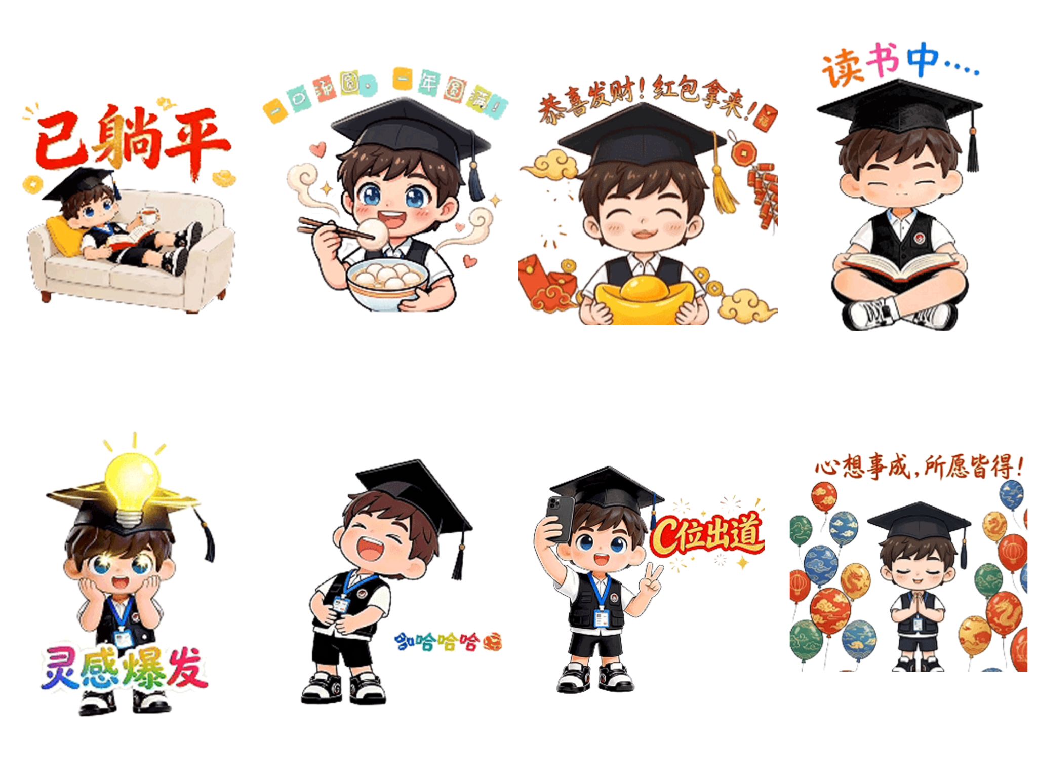 “工小曦”表情包围绕工大学子的日常学习、生活场景与节日祝福展开创作,覆盖学海奋斗、佳节团圆、日常百态、未来期许四大维度。从图书馆“读书中”的专注、论文完成后的“哈哈哈哈”,到元宵佳节的“一口汤圆,一年圆满”、新春的“恭喜发财,红包拿来”,再到早八的“已躺平”、脱单的雀跃,数十个表情生动还原了校园生活的点滴瞬间,精准戳中师生情感共鸣点,让校园情绪有了更鲜活的表达载体。