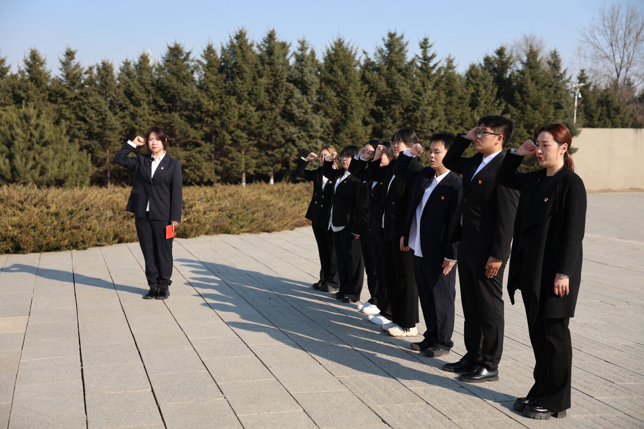 随后,在领誓人的带领下,全体同学高举右拳,重温誓词。铿锵有力的誓言在陵园回荡,既是对入团初心的回望,更是对英烈们的庄严承诺,充分展现了新时代青年坚定理想、勇担使命的精神风貌。